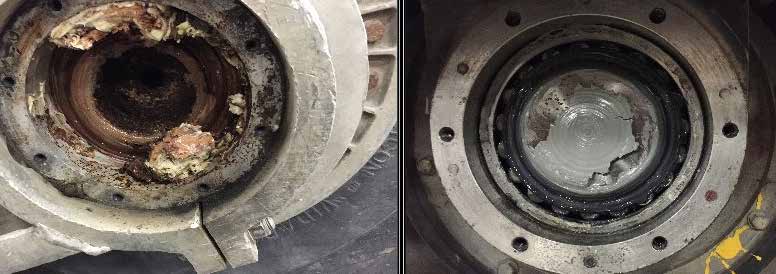 The Rolligon roller bearings are subject to harsh environmental conditions in Alaska, including -60°F (-51°C) temperatures, extremely high loads, low RPM (8-10), dirt, moisture, and idle time. The grease in use was a mineral grade lithium thickened NLGI 2 EP grease that would wax up when exposed to freezing temperatures, allowing the oil to run out of the thickener and bearing, while at the same time allowing the ingress of dirt and moisture. This led to complete saturation of the bearing and housing, which in turn caused excessive rust, lubricant degradation, bearing starvation, and numerous bearing failures.